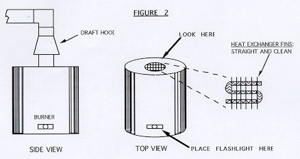 - Remove the draft hood and observe the heat exchanger (see Figure 2). The heat exchanger should be free of debris, corrosion and soot. All heating fins should be straight with a clean surface. Using a flashlight, place the light near the bottom of the boiler burner. When looking through the heat exchanger from the top of the boiler, you should be able to observe the light. If the heat exchanger does not meet the above criteria, call your serviceperson and replace the draft hood.