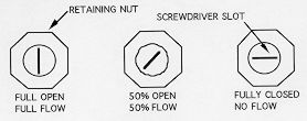 Loosen the retaining nut before attempting to adjust the balance valve. Insert a large screwdriver and rotate the valve either to the right or to the left. Rotating the valve 90° in either direction shuts off the water flow to that area. To balance a room, rotate the valve less than 90°. For example, if you rotated the valve 45°, you would reduce the water flow to that area by half (see Figure 3 below).